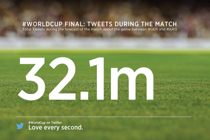 Hier l’Allemagne a décroché sa 4ème étoile de Champion du Monde de Football suite à sa victoire 1-0 en Finale de la Coupe du Monde 2014 disputée contre l’Argentine. Sur Twitter, le match a ainsi généré de nombreux tweets pendant et après la rencontre. Sur la durée du match, ce sont ainsi 32,1 millions de tweets qui ont été enregistrés. C’est un peu moins que les 35,6M de tweets envoyés durant la déroute 7-1 du Brésil face à la nationalmannschaft. Cette finale obtient cependant le record de tweets envoyés à la minute avec un pic à 618 725 tweets au moment de la victoire de l’Allemagne et du coup de sifflet final.