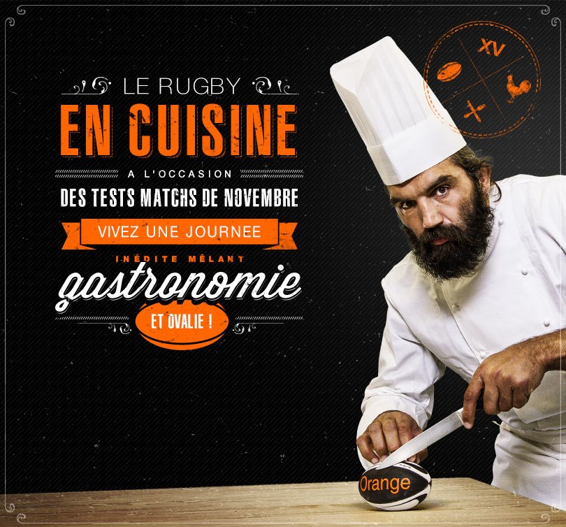 La marque organise en effet, via son site Ensemble avec le XV, un jeu concours mêlant rugby et gastronomie! A l’occasion de la rencontre France-Australie du 10 novembre prochain, Orange vous envoie au Stade de France pour assister au match de rugby, ok… mais surtout pour participer à un cours de cuisine en présence de Sébastien Chabal !