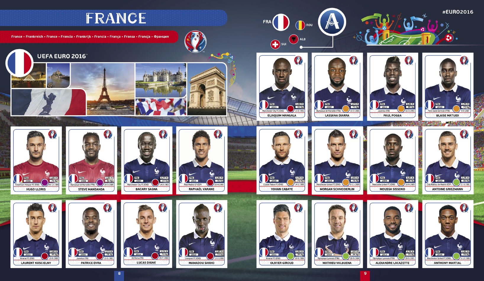 Dans son album officiel UEFA EURO 2016, Panini propose 96 pages et 680 stickers à collectionner dont 480 vignettes de joueurs. Pour chacune des 24 équipes, Panini a sélectionné une liste de 20 joueurs.