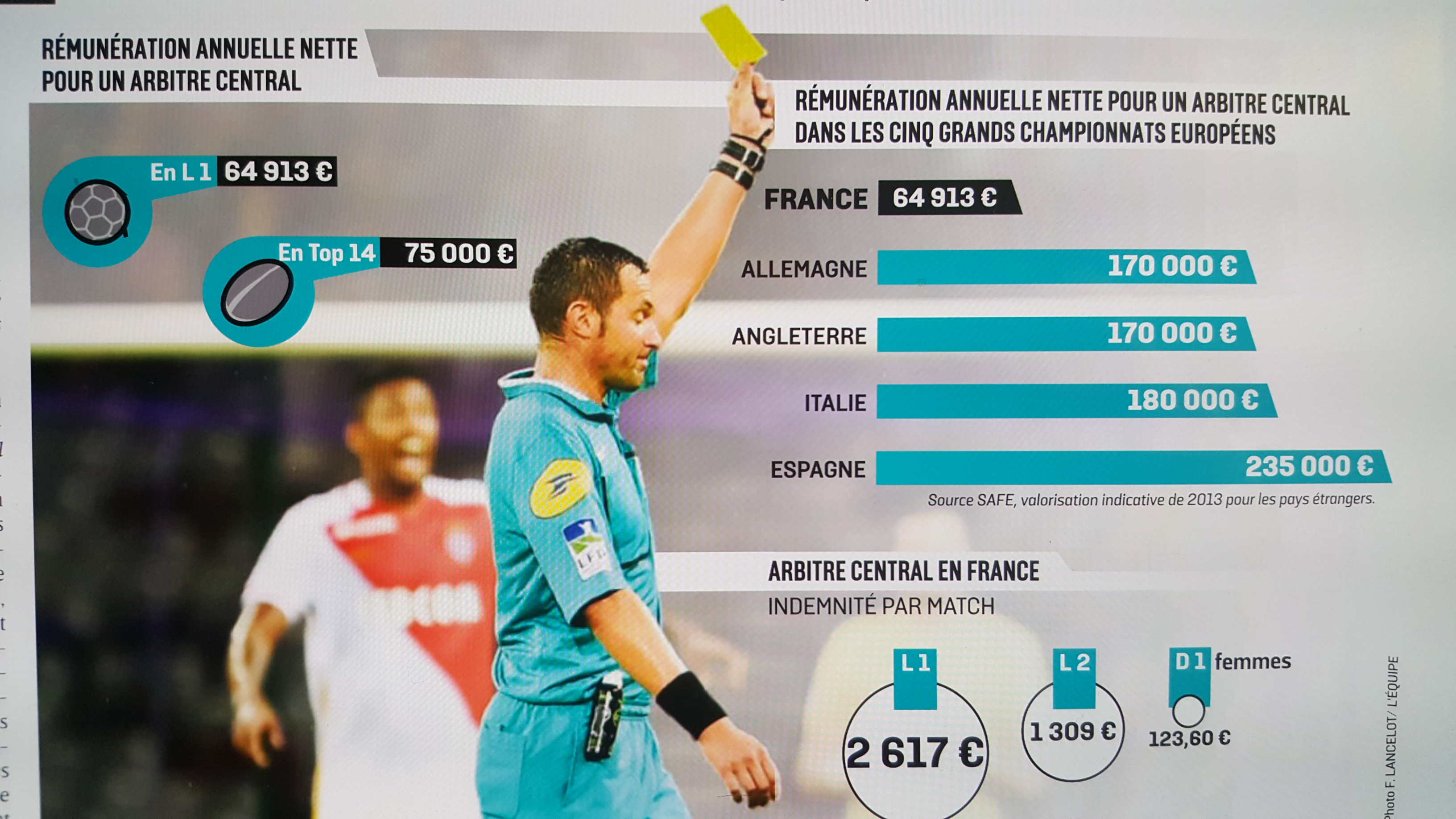 Dans son édition du jour, le quotidien L’Equipe fait le point sur le salaire des arbitres dans le football. Selon le syndicat des Arbitres de Football d’Elite (SAFE), un arbitre central touche une rémunération fixe mensuelle de 2 900 € plus 2 617 € par rencontre de L 1. D’après un document du SAFE, L’Equipe précise que le syndicat souhaiterait que ces sommes passent respectivement à 7 250 € et 6 542 €.