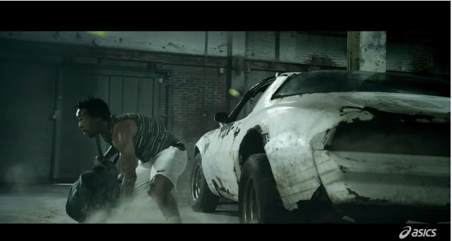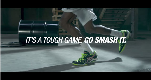 L’occasion pour Monfils de mettre en avant sa paire de chaussures Asics GEL-Resolution 6 de façon dynamique et spectaculaire, entre plongeons et glissades.