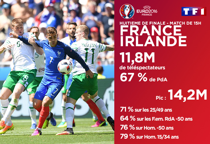 Si l’horaire du match en après-midi et un dimanche – malgré le match à élimination directe – a joué sur l’audience, TF1 a explosé les chiffres en parts d’audience. France – Irlande a ainsi rassemblé 67% des français qui étaient devant leur poste de télévision à ce moment.