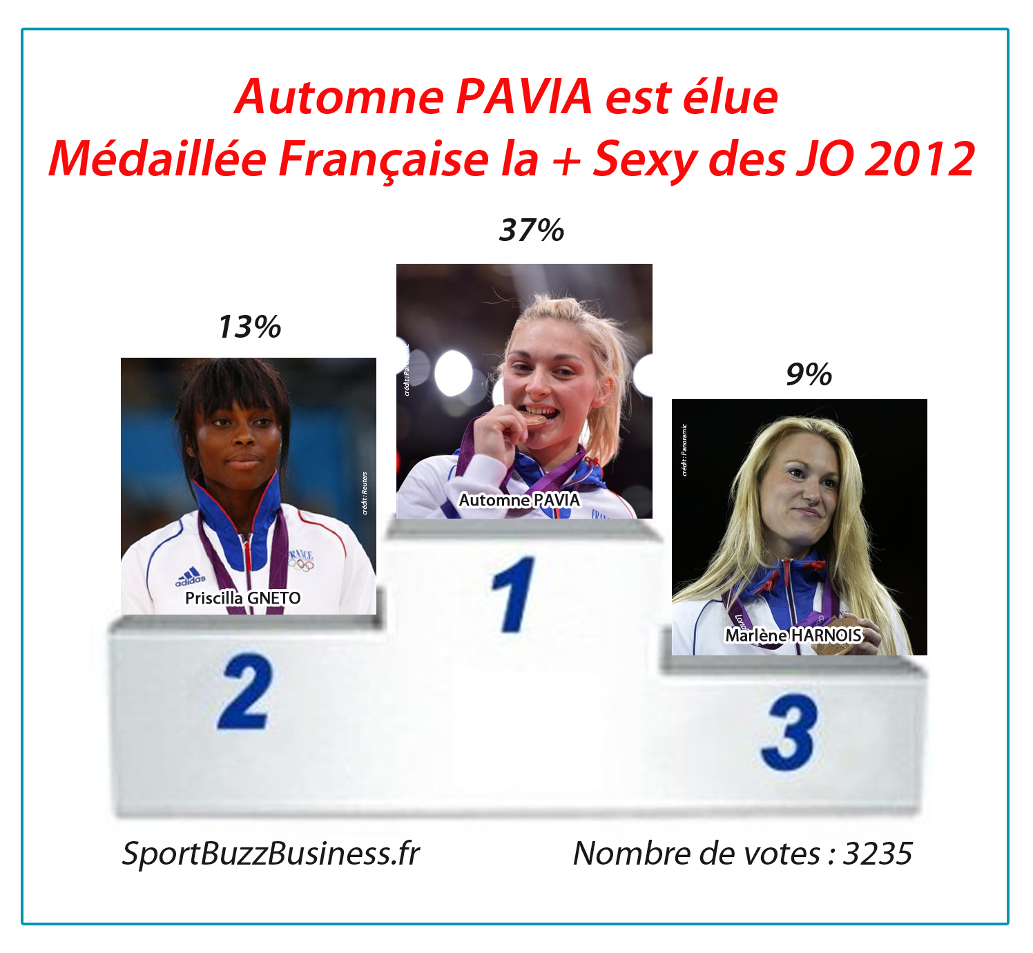 La judokate Automne Pavia, médaillée de bronze aux Jeux Olympiques 2012 en -57kg, a été élue médaillée française la plus sexy des JO de Londres 2012. Avec 37% des votes, la judokate décroche la médaille d’or et devance une autre judokate, Priscilla GNETO (médaille de bronze à Londres en -52kg), qui recueille 13% des votes. Ce podium Glamour est complété par Marlène HARNOIS (Médaille de Bronze à Londres en Taekwondo -57kg) qui obtient la médaille de bronze de notre classement avec 9% des votes ! Le charme de ces dames leur permettra t-il de décrocher rapidement quelques contrats sponsoring et d’images ? La réponse dans les prochains mois ! Merci aux 3 235 votants et aux athlètes françaises qui ont joué le jeu ! ;-) Le détail complet des votes est disponible ici.