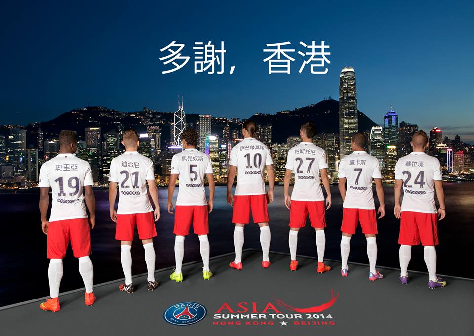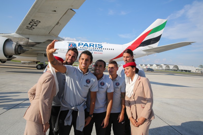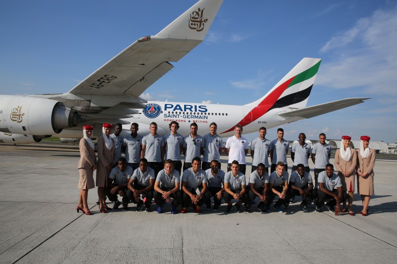 L’avion Emirates qui a emmené les joueurs à Hong Kong arborait ainsi le logo du Paris Saint-Germain. « Le Paris Saint-Germain est fier de porter la marque Emirates sur son maillot depuis 2006 et pour les 5 prochaines saisons. Aujourd’hui, pour la première tournée asiatique du club, nous sommes très honorés que l’avion de la compagnie Emirates porte sur son fuselage la marque du Paris Saint-Germain et offre à nos joueurs et notre staff des conditions de voyage idéales » a précisé Jean-Claude Blanc, Directeur Général délégué du Paris Saint-Germain, dans un communiqué.