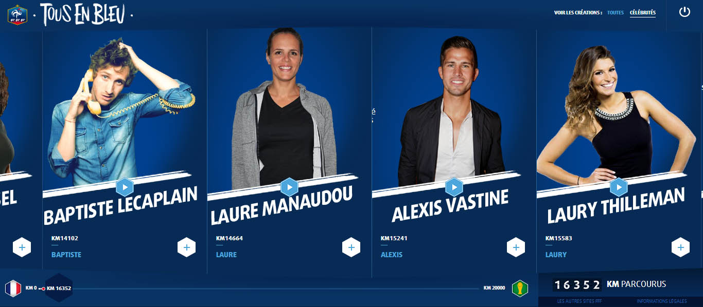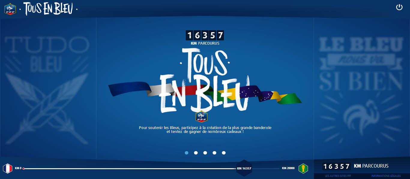 Pendant la Coupe du Monde 2014, la Fédération Française de Football invite les supporters de l’Equipe de France à participer au dispositif digital visant à créer la plus longue banderole d’encouragements qui reliera ainsi la France au Brésil. Via le site évènement tousenbleu.fr, vous pourrez ajouter votre message de soutien, faisant grandir ainsi la banderole (1 message = 1 kilomètre) qui a déjà parcouru plus de 16 000 kms ! Pour ce dispositif, la FFF a fait appel à l’agence Megalo&Company. Précisons que de nombreux cadeaux dont un voyage au Brésil viendront récompenser certains participants ! ;-)