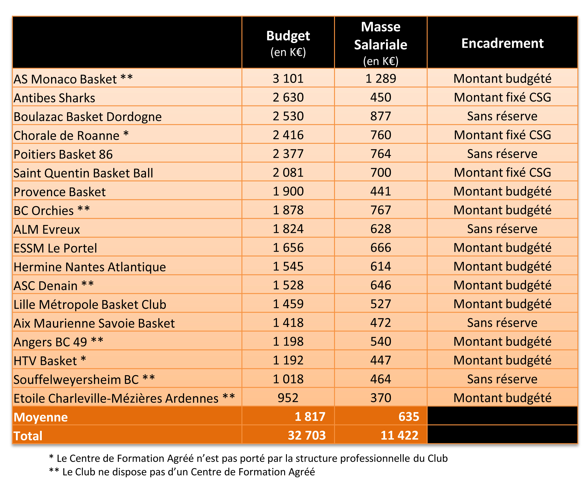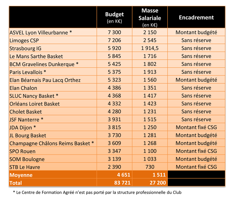 Dans son document, la LNB précise que les budgets sont ceux présentés à la Commission de Contrôle de Gestion le 15 septembre 2014. Les masses salariales exprimées sont celles accordées par le Conseil Supérieur de Gestion, actualisées au 24 septembre 2014. Ces montants ne tiennent pas compte du dépassement autorisé pour les Clubs engagés sans réserve. Les masses salariales incluent les salaires bruts et avantages en nature. Sont concernés : les entraîneurs principaux et assistants, les joueurs professionnels ainsi que les joueurs aspirants et stagiaires dans le cas où la structure professionnelle porte le Centre de Formation. Pour les clubs constitués en société sportive, les montants renseignés sont ceux de la société, et non les chiffres consolidés avec l’association support. Enfin, la LNB précise que l’ensemble de ces données est susceptible d’évoluer au cours de la saison.