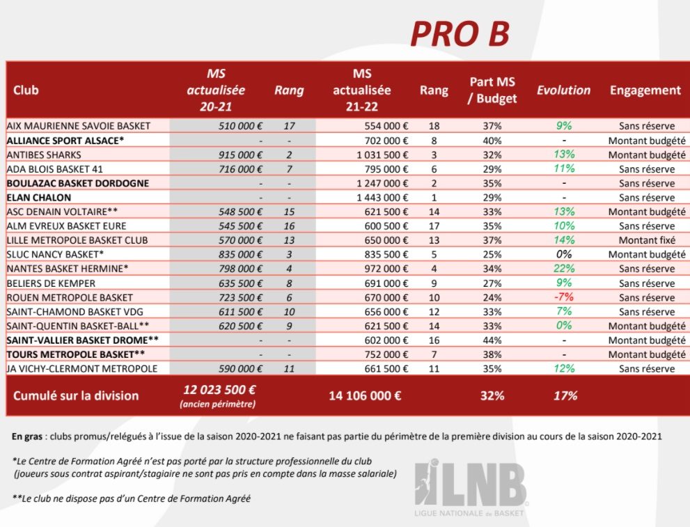 Les masses salariales exprimées sont celles accordées par le Conseil Supérieur de Gestion. Ces montants ne tiennent pas compte du dépassement autorisé pour les clubs engagés sans réserve (dépassement autorisé jusqu’à 150 000 € brut maximum). Les masses salariales incluent les salaires bruts et avantages en nature. Sont concernés les entraîneurs principaux et assistants, les joueurs professionnels ainsi que les joueurs aspirants et stagiaires dans le cas où la structure professionnelle porte le Centre de Formation.