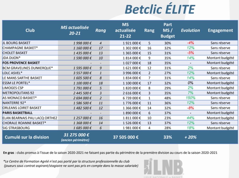 Basket – Le détail des budgets et masses salariales en Betclic Elite et Pro B pour la saison 2021-2022