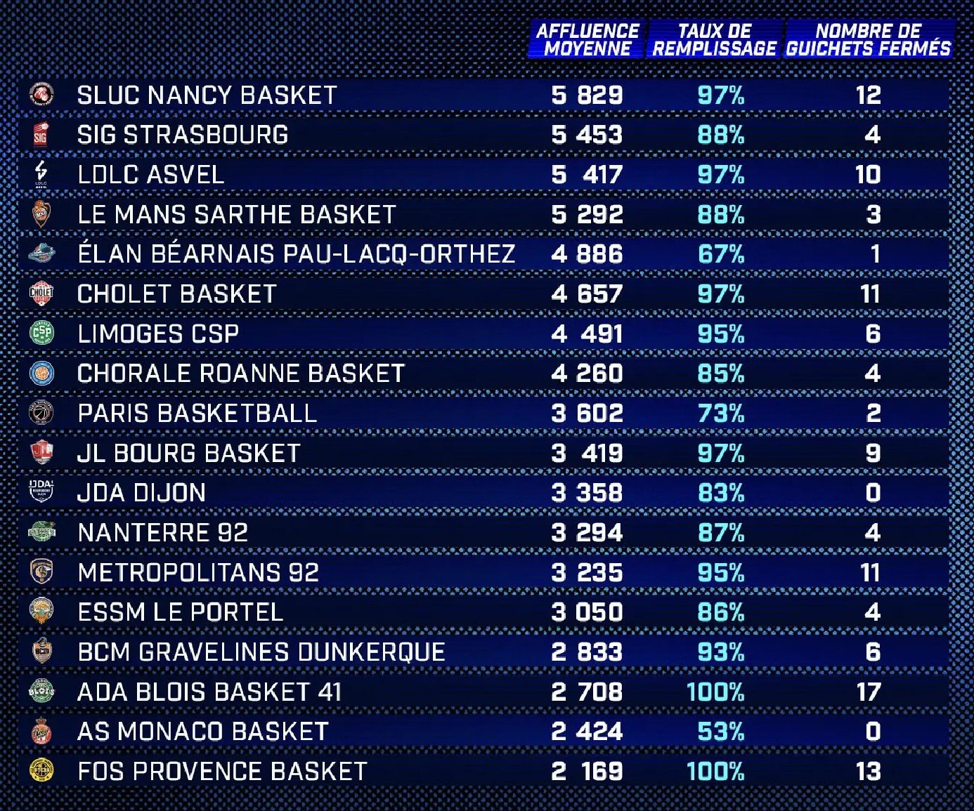 Le club du Sluc Nancy Basket signe le nouveau record d’affluence moyenne pour un club sur une saison dans les championnats LNB avec 5 829 spectateurs par match.