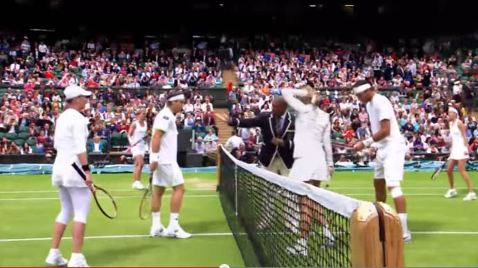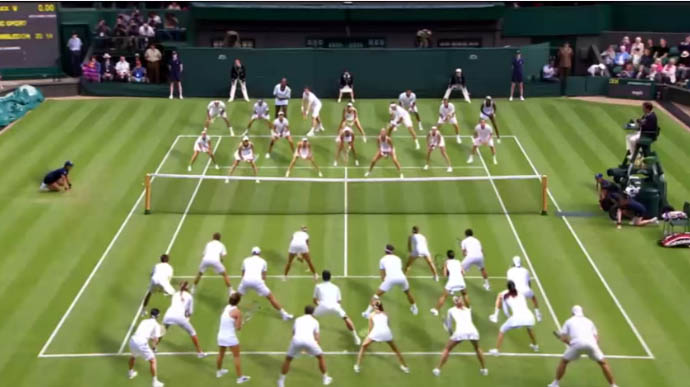 Lundi prochain, les fans de tennis se mettent au vert avec le début de Wimbledon. Un tournoi du Grand Chelem que les anglais pourront suivre à la TV et sur les différents supports mobiles via BBC Sport. Pour l’occasion, la chaîne a réalisé un spot publicitaire réunissant, sur un même terrain, les têtes d’affiches que sont Federer, Nadal, Djokovic, Wawrinka, Murray, Tsonga, Berdych, Sharapova, les soeurs Williams, Azarenka, Li Na ou encore A. Radwanska. Que le spectacle commence ! ;-)