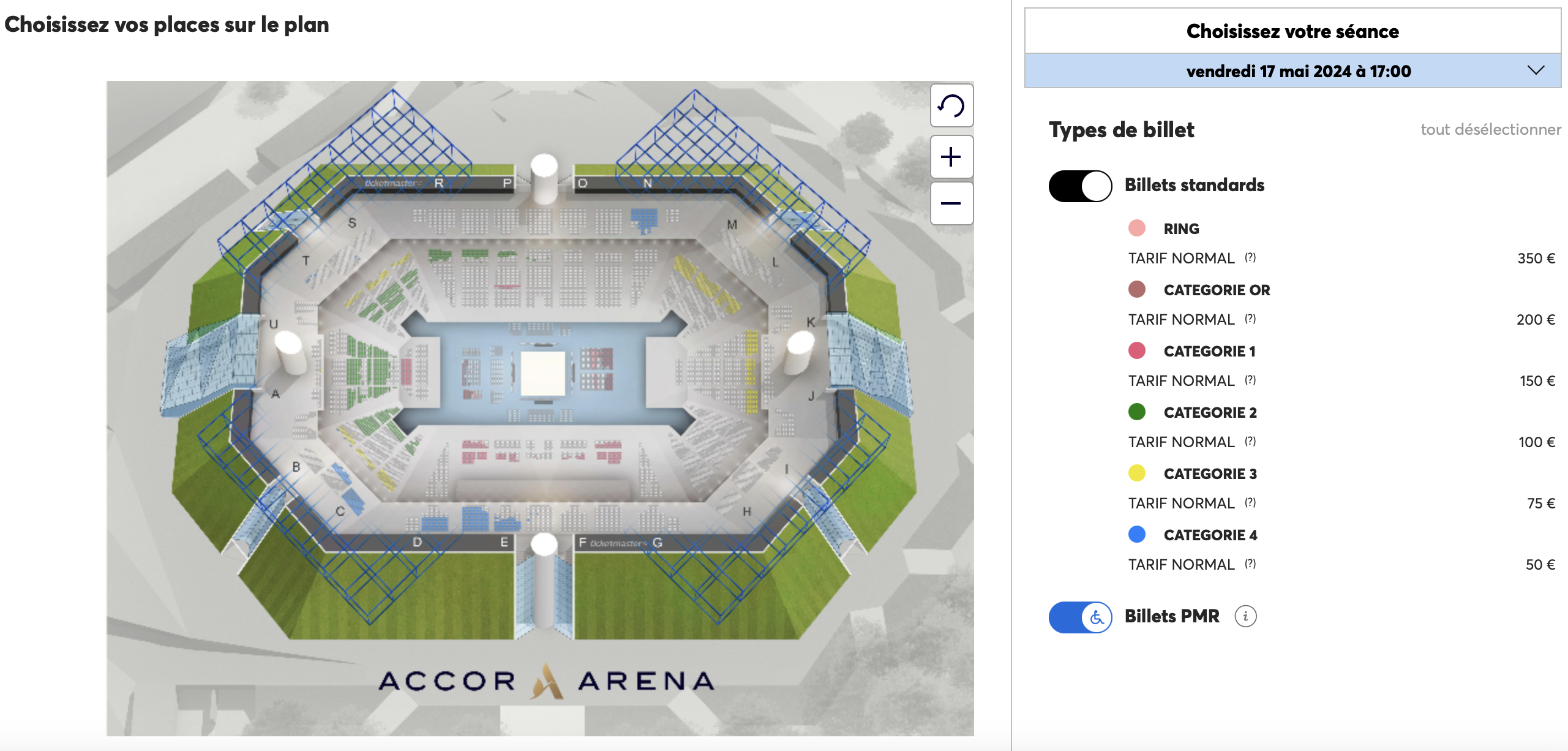 Pour les plus prestigieuses, proche de l’octogone, il faudra débourser 350€ contre 50€ pour la place la moins chère en catégorie 4. Pour le reste, on trouve des tickets à 75€, 100€, 150€ ou encore 200€.