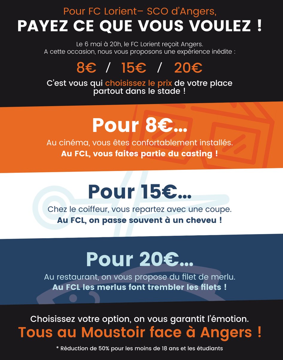 Samedi 6 mai, le FC Lorient accueille le SCO Angers dans le cadre de la 36ème journée de Ligue 1. Pour cette rencontre, le club a décidé de mettre en place une opération ticketing « originale » en invitant les Fans à choisir le prix de leur siège. De quoi motiver les lorientais à venir au stade soutenir les joueurs dans la lutte pour le maintien.