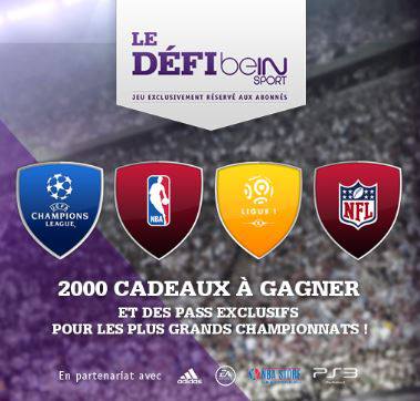 Jusqu’au 4 août prochain, vous devrez répondre à des questions quotidiennes et hebdomadaires. « la question du jour » sera posée sur directement sur le site ledefi.beinsport.fr. Vos bonnes réponses et votre rapidité vous permettront de récolter des étoiles. Afin de créer un lien avec la chaîne, la « question de la semaine » de l’inimitable Darren Tulett sera diffusée uniquement sur les antennes de beIN SPORT ! La réponse sera à donner via le site ledefi.beinsport.fr. A l’issue du concours, un classement déterminera les grands vainqueurs du classement général. Le grand vainqueur devra choisir entre 13 matchs pour 2 pour la prochaine Ligue des Champions (transports et hébergement compris) et 38 MATCHS pour 2 personnes pour assister à toute les rencontres d’une équipe de Ligue 1 ! Le second du classement n’aura pas le choix et devra partir deux fois aux USA pour assister à un match de NFL puis pour un match NBA (2 personnes) Dur ! ;-) Le troisième remportera 2 places pour 1 match de Ligue des Champions ou 1 séjour de 5 jours aux USA afin d’assister à 1 match NBA pour 2 personnes.