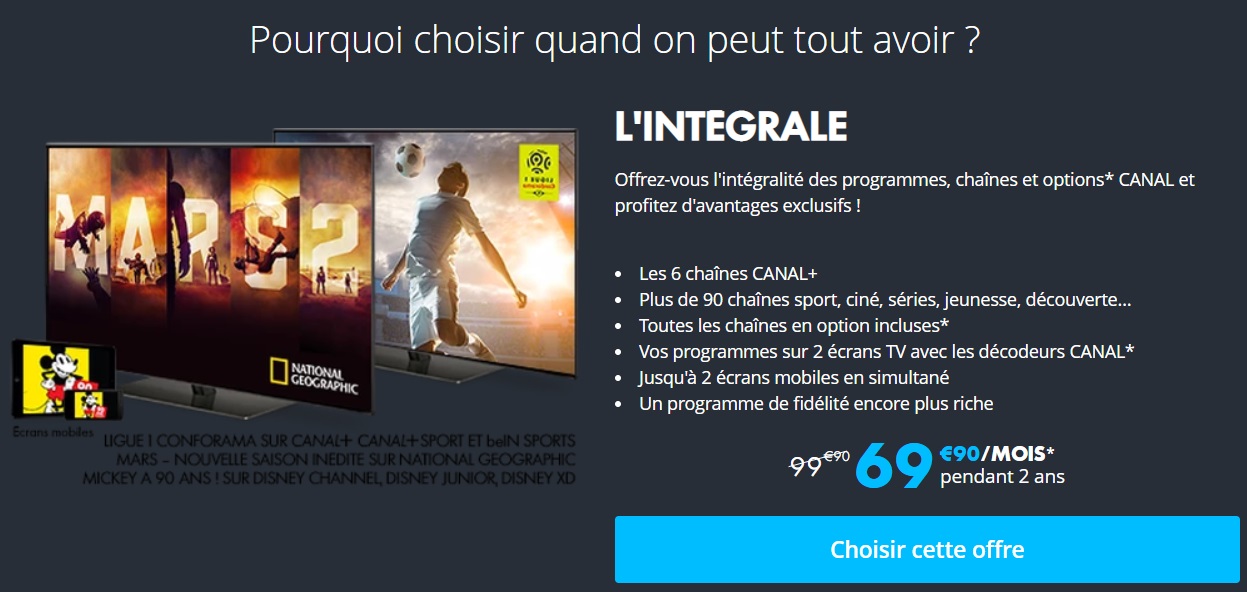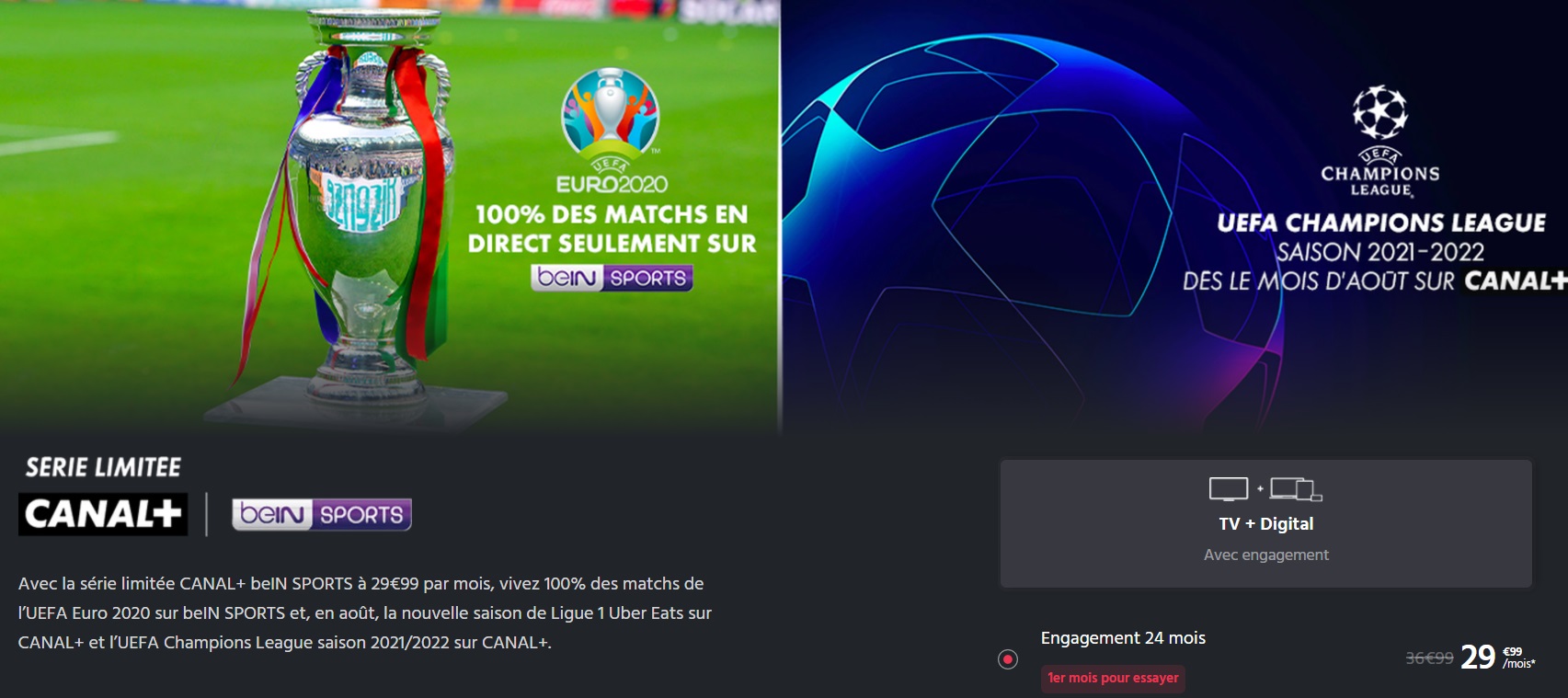 Pour combler les fans de sport et notamment de football, CANAL+ lance une offre d’abonnement (2 écrans simultanés) incluant les chaînes CANAL+ et les chaines beIN SPORTS à 25,99€/mois pendant les 12 premiers mois (puis 35,99€/mois) avec un engagement de deux ans.