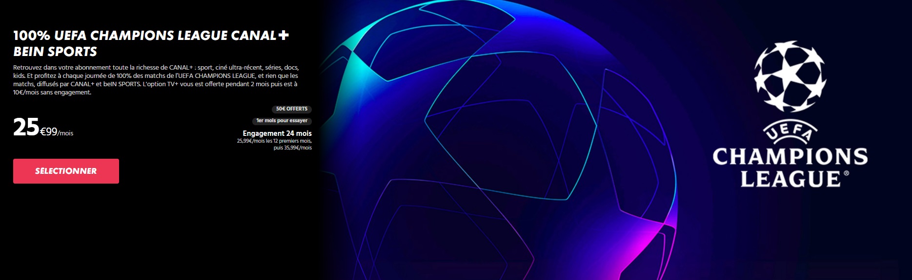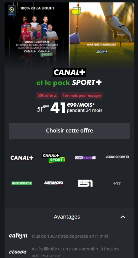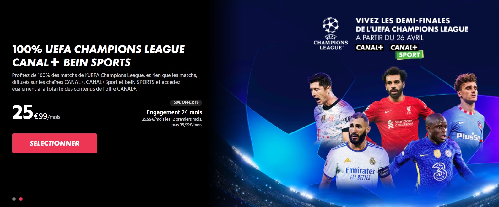 Découvrez l’offre 100% CANAL+ : vivez toute l’intensité du sport avec la Premier League, le TOP 14, la Formule 1®, le MotoGP™, ainsi que 100% des matchs de coupes d’Europe pendant 24 mois, sans oublier beIN SPORTS inclus 3 mois. Profitez aussi du meilleur du cinéma récent et des séries Création Originale CANAL+. Le tout pour seulement 19,99€/mois pendant 24 mois, puis 32,99€/mois… avec en bonus 50€ offerts !