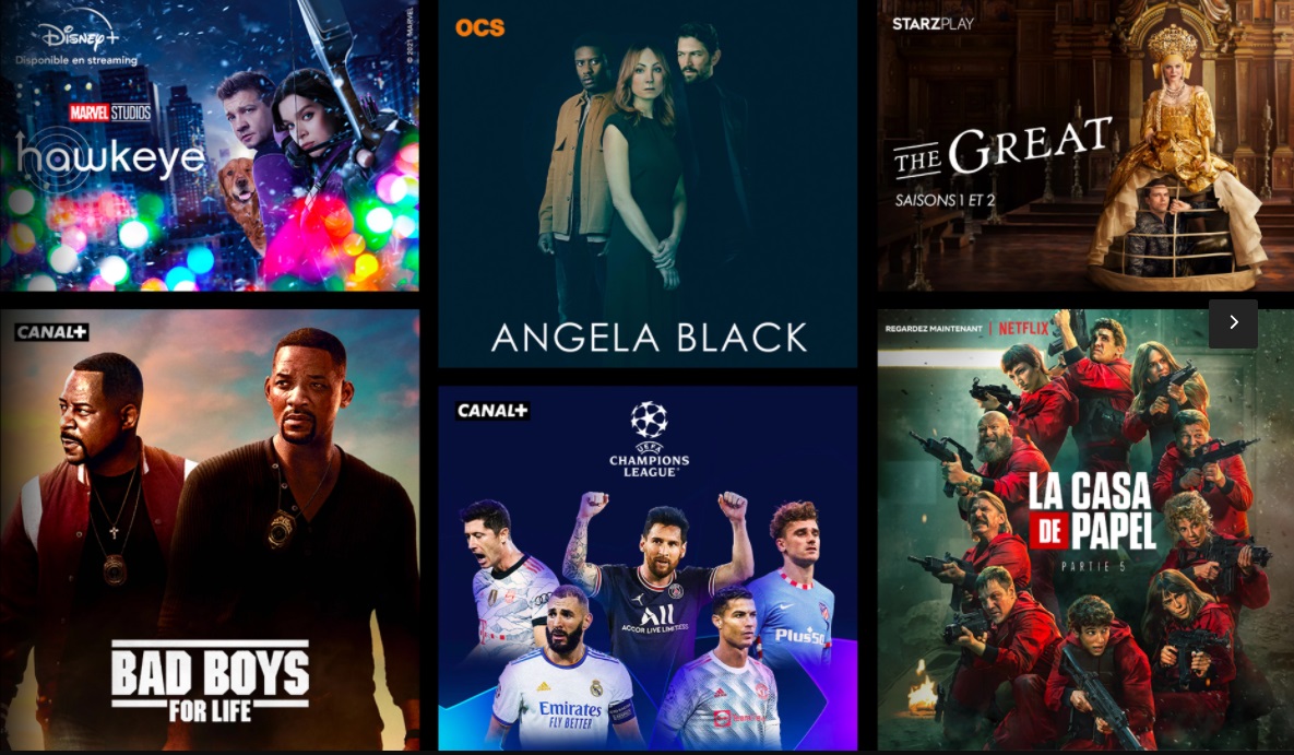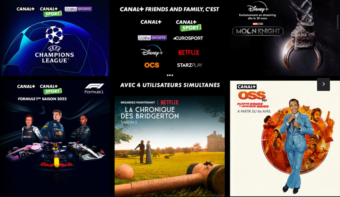 Pour ceux qui veulent le meilleur de tout, dans toutes les thématiques. Cinéma ultra récent, Création Originale, séries internationales exclusives, et la meilleure affiche de l’UEFA Champions League, de la Ligue 1, de la Premier League, du Top 14, Grand prix de Formule 1, Grand prix de Moto GP…