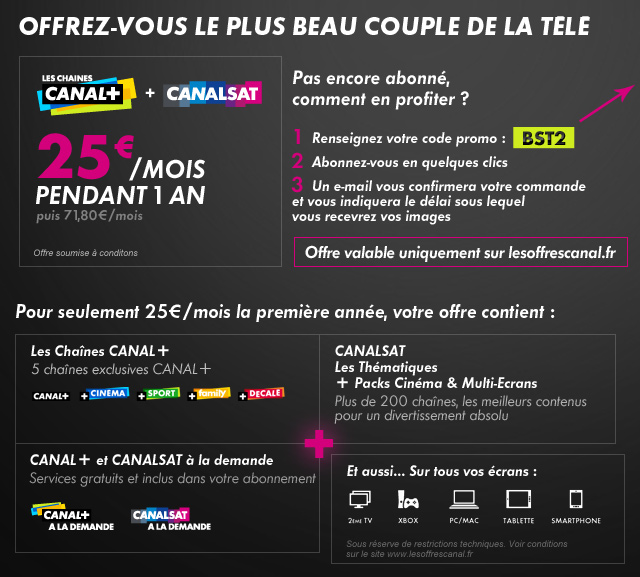 Non vous ne rêvez pas ! Les offres à prix cassés du groupe Canal continuent jusqu’au 31 janvier 2012 ! Vous avez la possibilité de vous abonner à Canal+ ET à Canalsat pour 25€/mois au lieu de 71,80€/mois, pour une durée d’un an. Une chance pour ceux qui souhaitent bénéficier d’une offre très attractive et franchir le pas sans pour autant casser leur tirelire. L’abonnement comprend donc Canal+ et ses 5 chaines (dont Canal+ Sport) + Canalsat Les Thématiques (plus de 200 chaînes dont l’Equipe TV, Infosport, Sport+ et Eurosport !) + les Packs CINEMA et MULTI ECRANS. Pour finir, les frais d’accès sont offerts ! Vous pourrez vous abonner via ADSL/Fibre TNT ou Satellite.Pour profiter de cette offre commerciale imbattable pour les amoureux de sports, il vous suffit de rentrer le code promo suivant (BST2) au moment de votre inscription, en cliquant sur les liens ci-dessous. Alors si vous êtes fan de sport et que vous avez les moyens financiers, c’est le moment de vous faire plaisir avant le 31 janvier 2012. Vous ne pourrez pas dire que vous n’étiez pas au courant ! ;-)