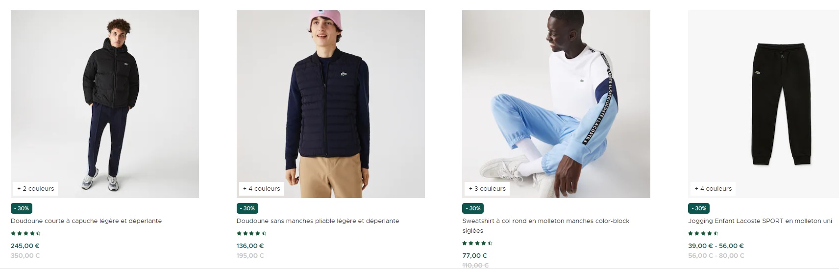 Dans le détail, la marque au croco propose sur sa boutique en ligne plus d’un millier d’articles avec des remises allant jusqu’à -50%.