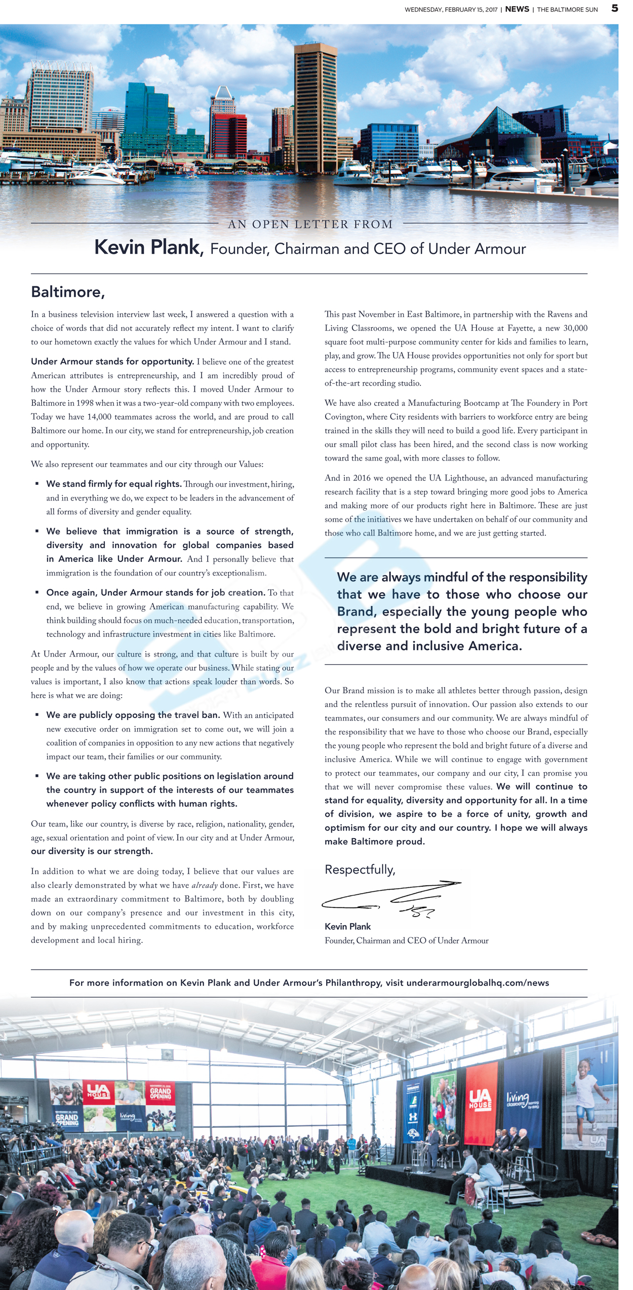 « J’ai répondu à une question avec des mots qui ne représentent pas ma vision. Je souhaite vous clarifier les valeurs d’Under Armour. […] Nous croyons en une immigration source de force, diversité et innovation pour les entreprises américaines comme Under Armour » Dans cette pleine page, le boss d’Under Armour réaffirme également des valeurs d’égalité, de travail. « En période de division, nous aspirons à être un élément d’unité, de croissance et d’optimisme pour notre ville et notre pays. J’espère que nous rendrons toujours fier Baltimore. »