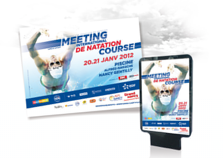 L’Equipe de France des mondiaux de Shanghai fera son entrée à Nancy à l’occasion du Meeting international de Natation course, première compétition officielle de l’année. L’agence Illustrasport s’est donc naturellement attachée à concevoir l’affiche de la compétition ainsi que les déclinaisons visuelles nécessaires à sa promotion. En intégrant Camille Lacourt sur le départ d’une course de dos, le visuel propose une vision originale et décalée de la discipline en réalisant un focus sur la pureté de la gestuelle du nageur en action.
