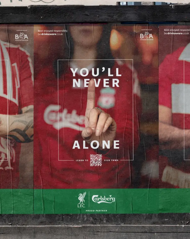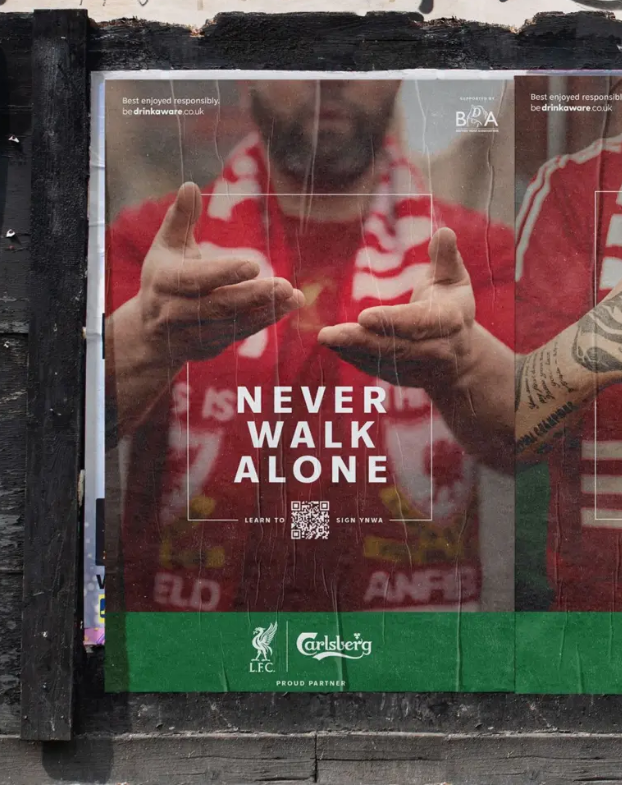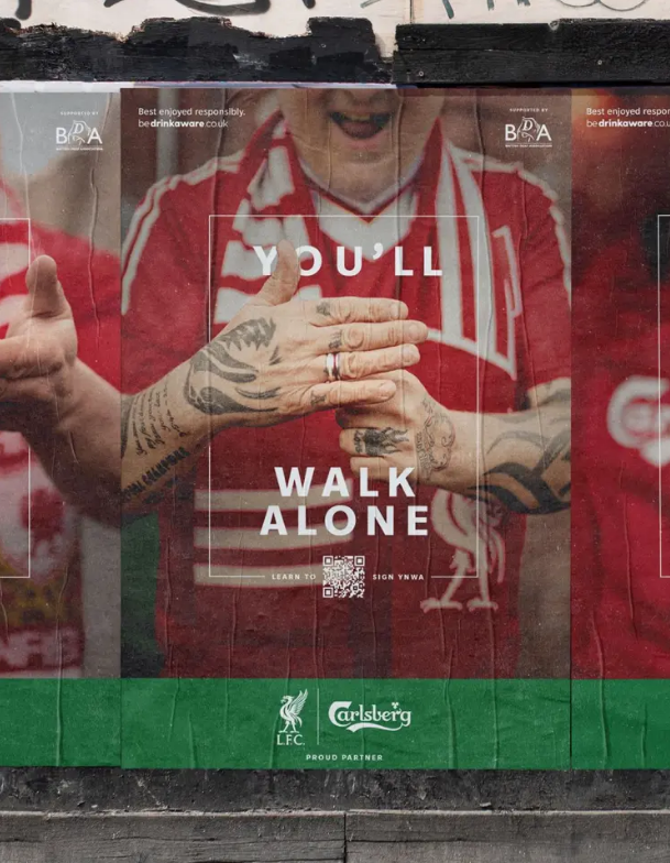 Le Liverpool FC et son partenaire historique Carlsberg ont présenté une adaptation en langue des signes britannique (BSL) de l’hymne “You’ll Never Walk Alone”. Développée avec la British Deaf Association, l’initiative repose sur quatre gestes clés – You, Never, Walk, Alone – conçus pour transmettre le sens collectif du refrain plutôt qu’une traduction littérale.