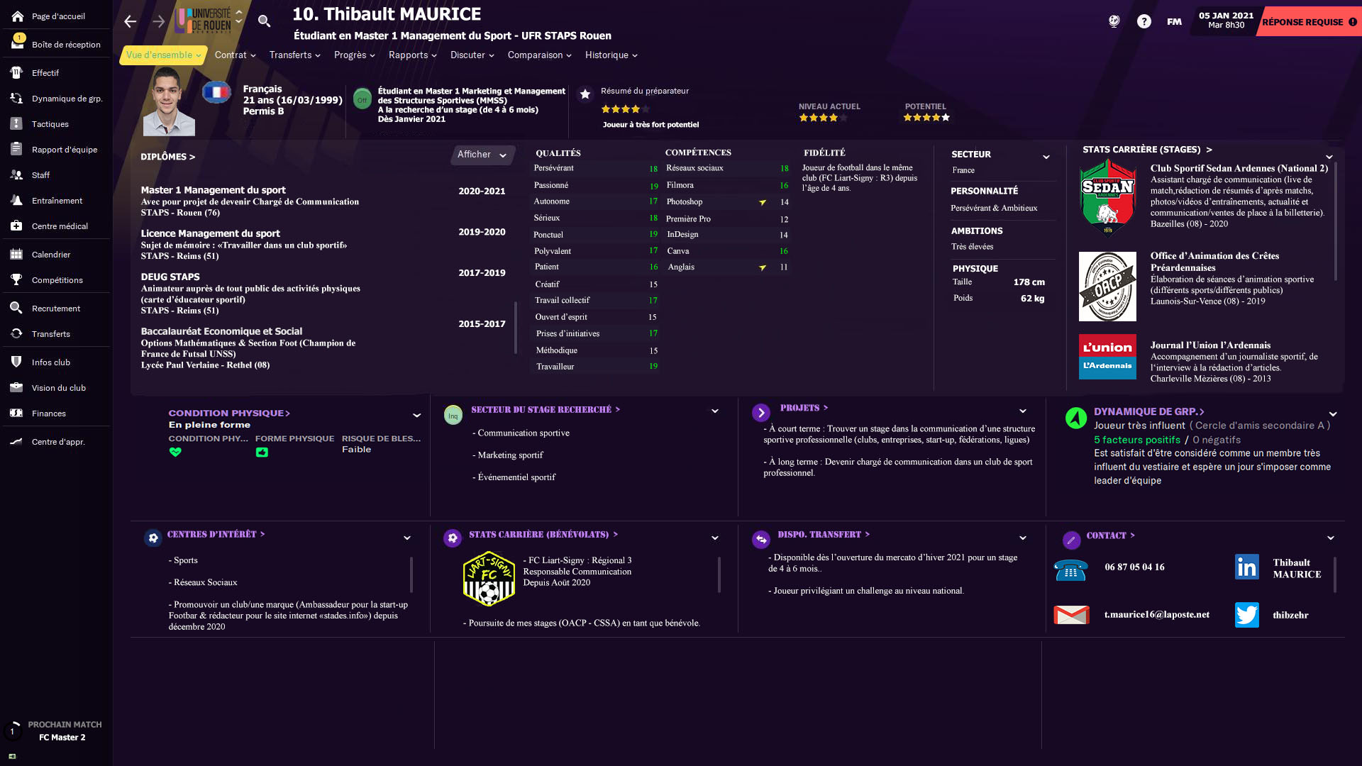 Profil à recruter Sport RH A recruter (stage) : Thibault MAURICE – Chargé de communication (CV Façon « Football Manager ») ParPartenaire11 janvier 2021