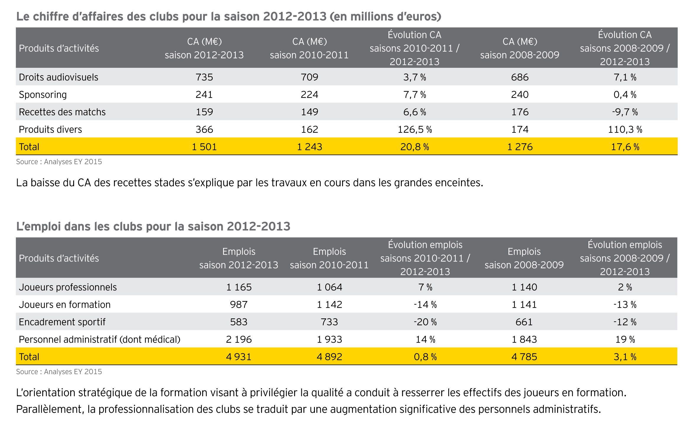 Au seul niveau des clubs, les postes de recettes augmentent de 20,8% : les droits audiovisuels enregistrent une croissance de 4%, alors que le sponsoring et les recettes des matchs inversent la tendance par rapport à la baisse observée en 2012 (respectivement +8% et +7%).