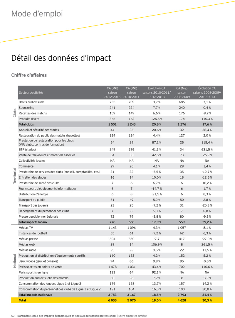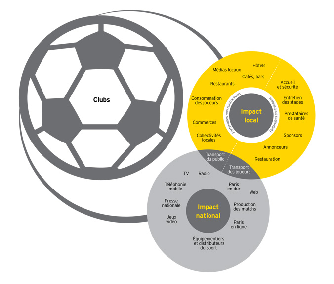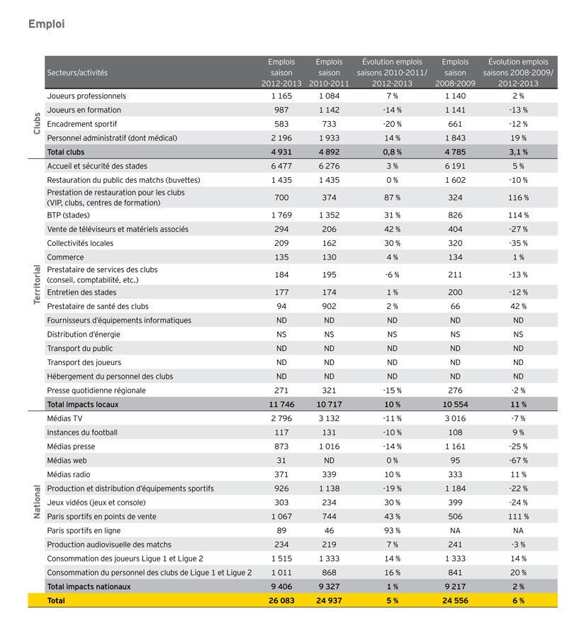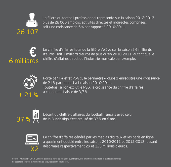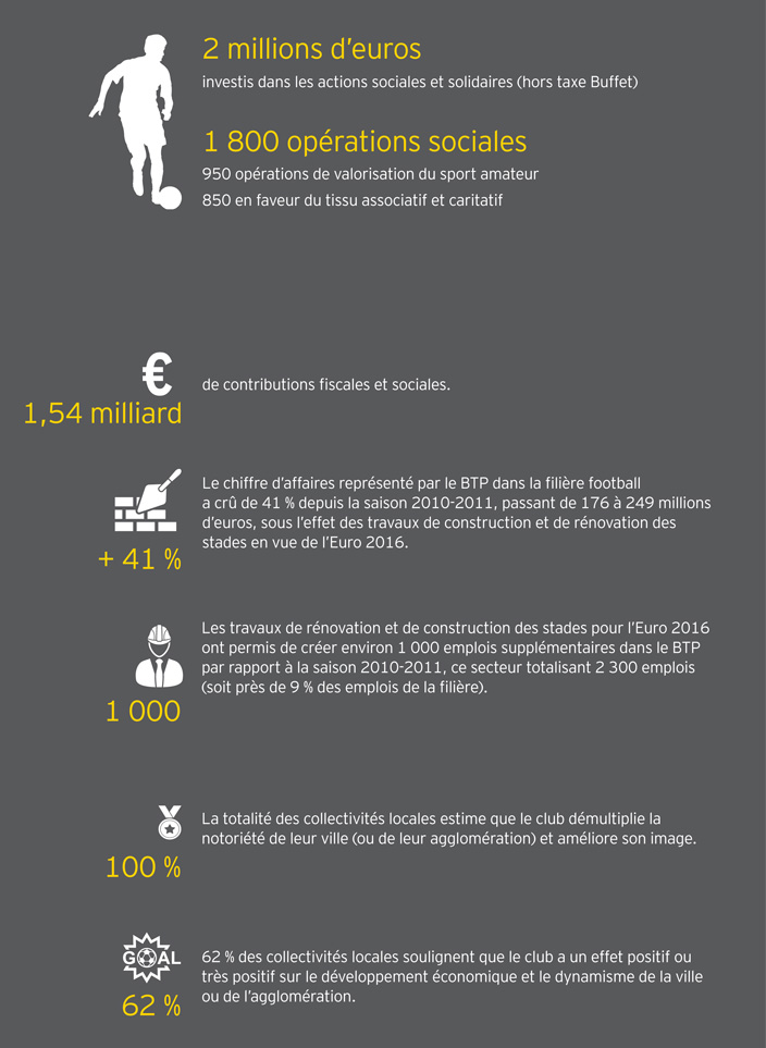 Pour la saison 2012-2013, la filière Foot Pro a atteint un chiffre d’affaires total de 6 milliards d’euros, en hausse de 19% par rapport à la saison 2010-2011. L’ensemble de l’économie autour des 44 clubs professionnels génère, directement ou indirectement, plus de 26 100 emplois (1 000 supplémentaires par rapport à l’édition précédente). Les contributions fiscales et sociales liées à l’activité des clubs s’élèvent à 1,54 milliard d’euros pour l’ensemble de la filière, la moitié de ces recette étant portée par les clubs et leurs salariés.