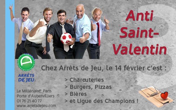 La nouvelle chaîne de resto-Sport Arrêts de Jeu organise ce soir une soirée Anti Saint-Valentin ! Situé Porte d’Aubervilliers, le restaurant vous propose de vivre une soirée Burgers, bières et Ligue des Champions. Il est conseillé d’appeler au 01 76 21 40 77 pour une réservation. Pour rappel, Arrêts de jeu vous offre le café et le dessert avec le code « SportBuzzBusiness.fr » ! Bonne soirée !