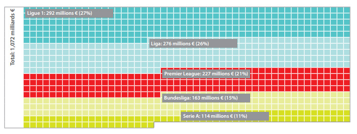 Depuis juillet 2012, les clubs engagés actuellement dans les 5 principaux championnats de football européen ont généré 1,07 milliards d’euros à travers le transfert de joueurs issus de leur centre de formation. Cocorico, la Ligue 1 pointe en tête du classement par ligue avec 292 millions d’euros générés. Le LOSC est deuxième au classement des clubs grâce notamment à la vente d’Eden Hazard à Chelsea. L’Olympique Lyonnais, absent de ce classement, devrait figurer en bonne place dans les années à venir si il décide de vendre quelques uns de ces joueurs formés (Lacazette, Grenier, Gonalons…).