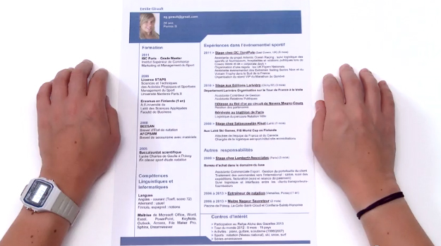 « De retour d’un tour du monde en 2012 et d’une participation au Rallye Aïcha des Gazelles en mars 2013, je suis intéressée par un poste dans l’événementiel sportif, le commercial et plus précisément dans les Relations Publiques. Passionnée par le sport, je possède une licence STAPS-Management du sport (Sciences et Techniques des Activités Physiques et Sportives) de l’université de Nanterre Paris 10 et un master en école de commerce (ISC Paris) spécialisé en Management du Sport ».