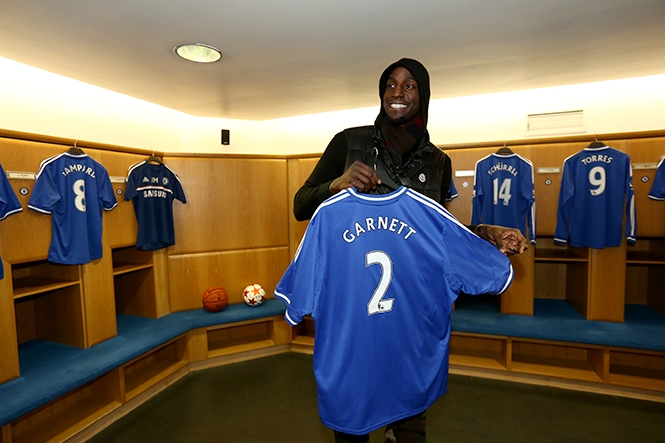 A l’occasion du match NBA de saison régulière organisé à Londres demain (NBA Global Games London 2014) entre les Atlanta Hawks et les Nets de Brooklyn à l’O2 Arena, le club de Premier League de Chelsea a reçu la visite hier du joueur des Nets Kevin Garnett, fan des Blues. Le joueur NBA a ainsi reçu le maillot de Chelsea floqué du nom Garnett et du numéro 2. Une rencontre certainement facilitée par adidas, équipementier de la NBA et de Chelsea.