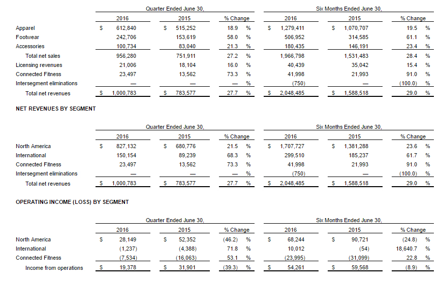 La progression des ventes Under Armour est tirée notamment par la catégorie basketball, Steph Curry et ses nouvelles chaussures signatures. Le segment footwear affiche ainsi une croissance de 61,1% sur le premier semestre 2016 vs 2015. Et comme l’indique Kevin Plank le CEO d’UA « Les chaussures de Stephen Curry offrent un vrai coup de pouce à la marque tout comme les crampons Highlight Cleat qui continuent de dominer le marché du Foot US ».