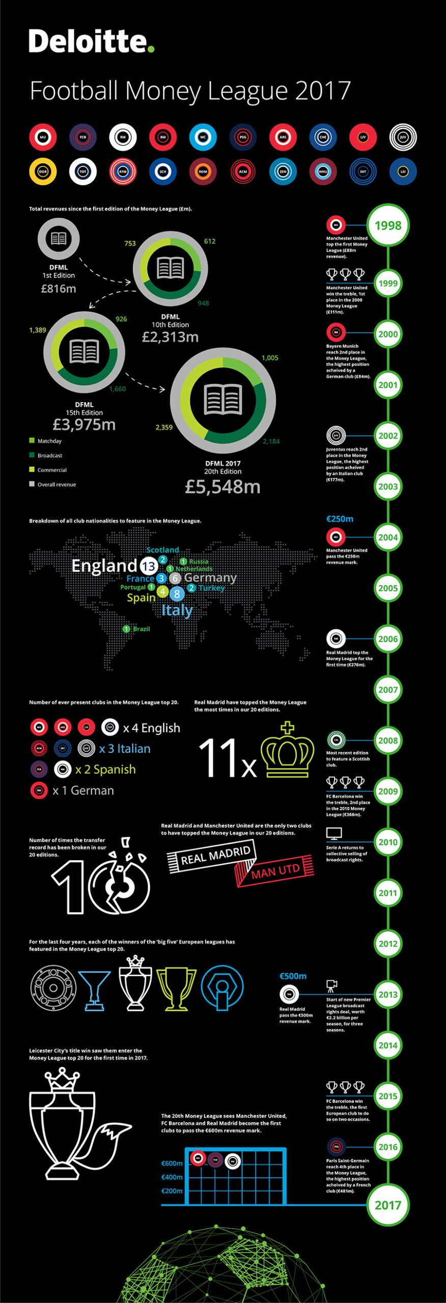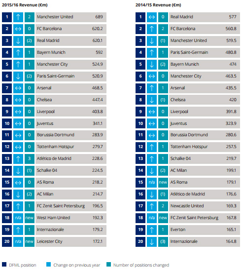 TOP 30 des clubs qui génèrent le plus de revenus (saison 2015/2016) – Deloitte Football Money League 2017