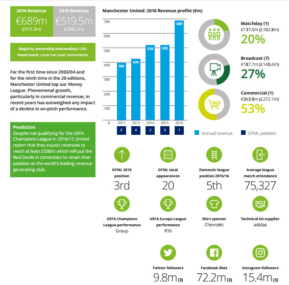 En tête du classement, et c’est une « petite révolution », Manchester United met fin à 11 ans de règne du Real Madrid. Le club de Premier League est le club qui a généré le plus d’argent en 2015-2016 avec 689 millions d’euros.