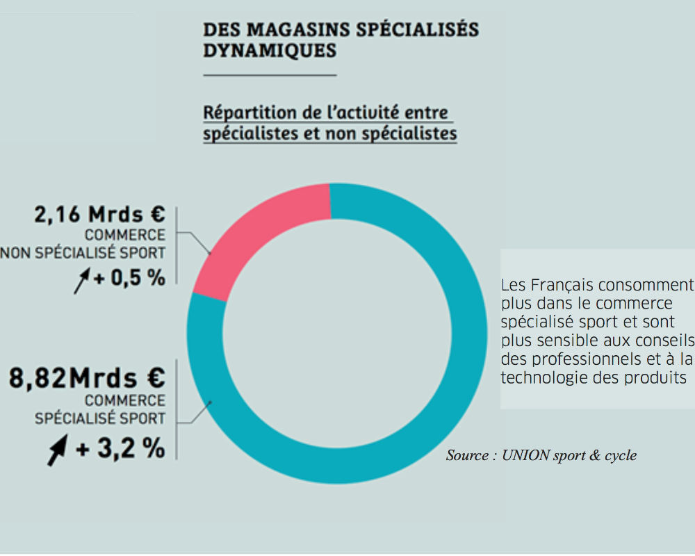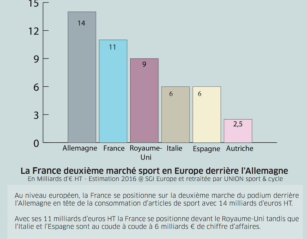 Avec 11 milliards d’euros (10,98), la France représente le second marché sport en Europe derrière l’Allemagne et ses 14 milliards €.