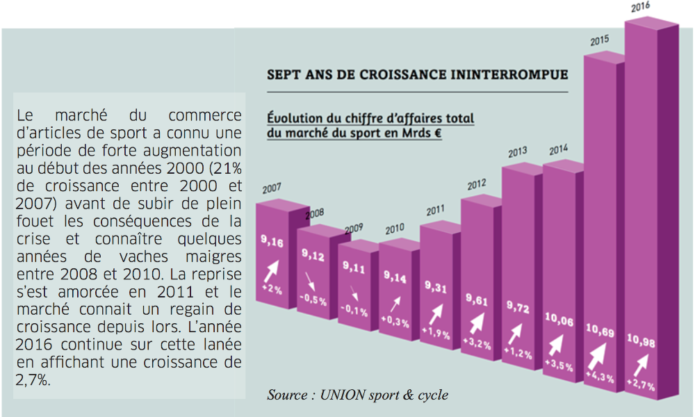 Dans le détail, le marché de la chaussure de sport enregistre une croissance de 7,8 % en 2016 VS 2015. Le textile sport reste la catégorie leader et enregistre une hausse de 1,3% de ses ventes.