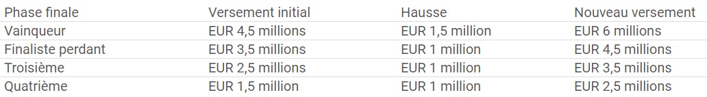 En remportant son groupe, une équipe de Ligue A empochera une prime de 2,25M€ supplémentaires. Les 4 vainqueurs de groupe de la Ligue A empocheront donc 4,5M€ à l’issue de la première phase. Ces 4 équipes participeront alors à la phase finale de l’UEFA Nations League en juin 2019. Le vainqueur de la première finale empochera un chèque additionnel de 6M€, soit un total de 10,5 millions d’euros.
