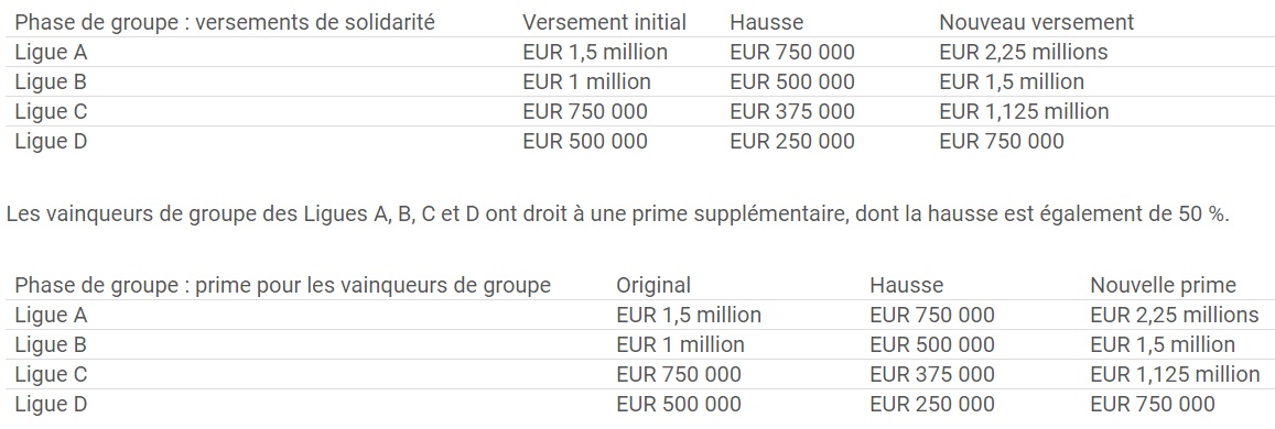 Dans un premier temps, chaque fédération qui participe à la Nations League et qui se trouve dans la Ligue A va recevoir une prime de solidarité/engagement de 2,25 millions d’euros. C’est 750 000 euros de plus de ce qui était prévu initialement. Pour les équipes des Ligues B, C et D, le montant sera respectivement de 1,5M€, 1,125M€ et 750 000€.