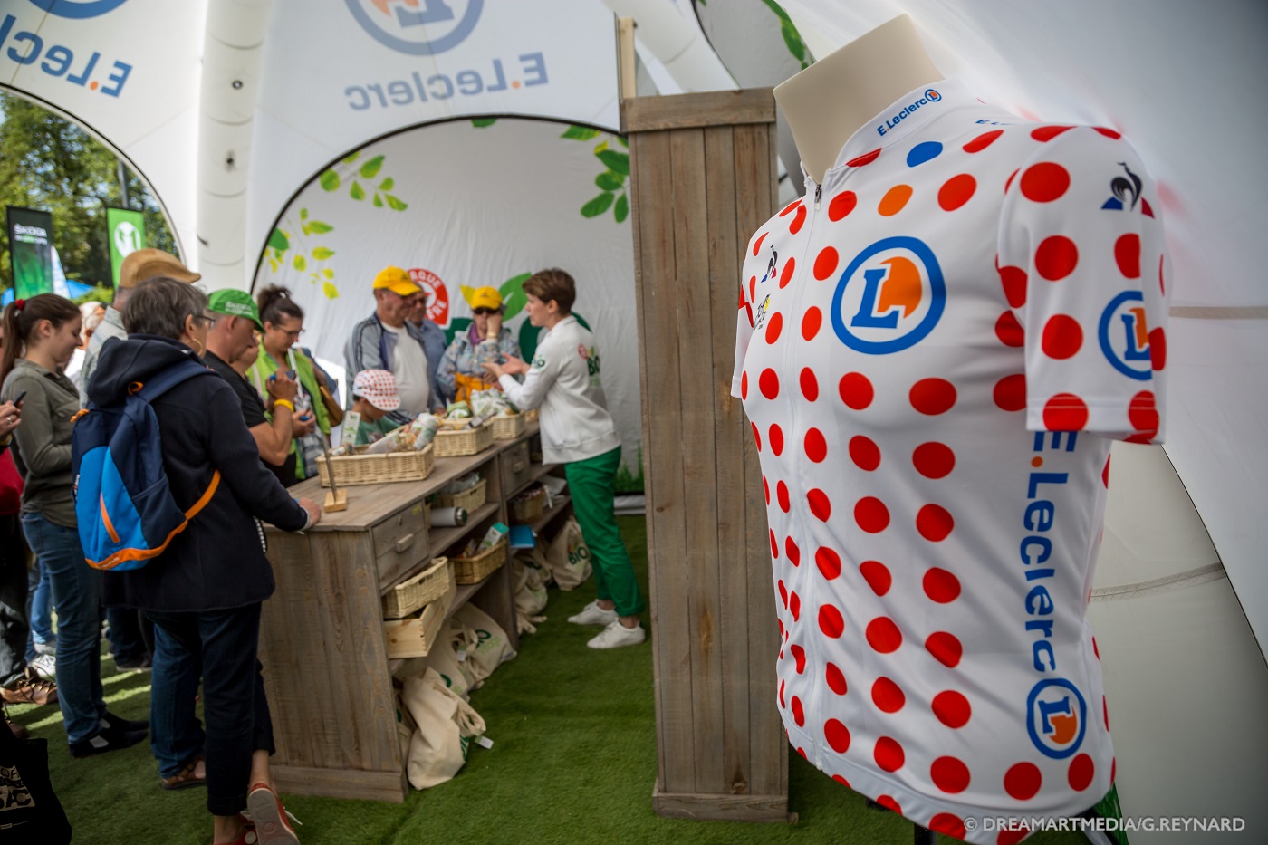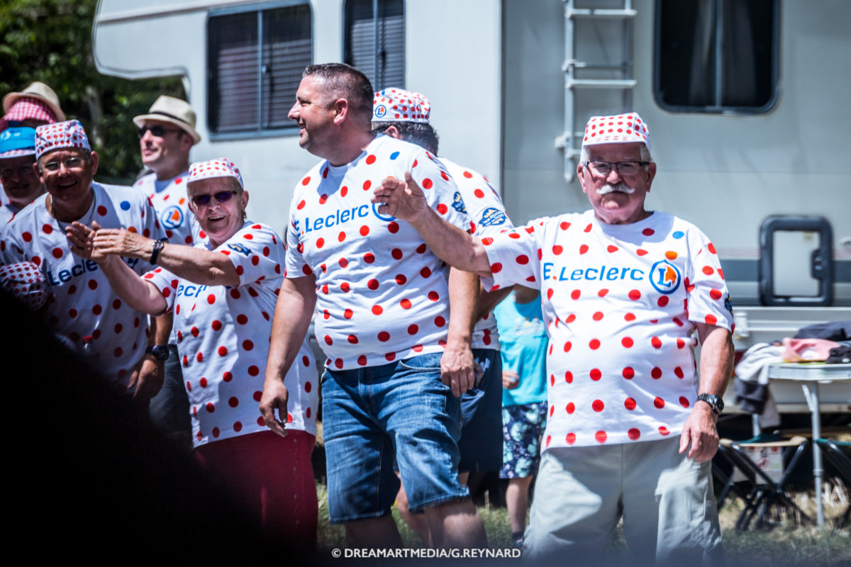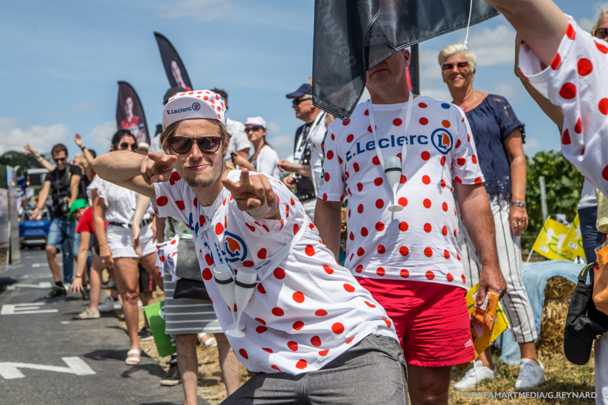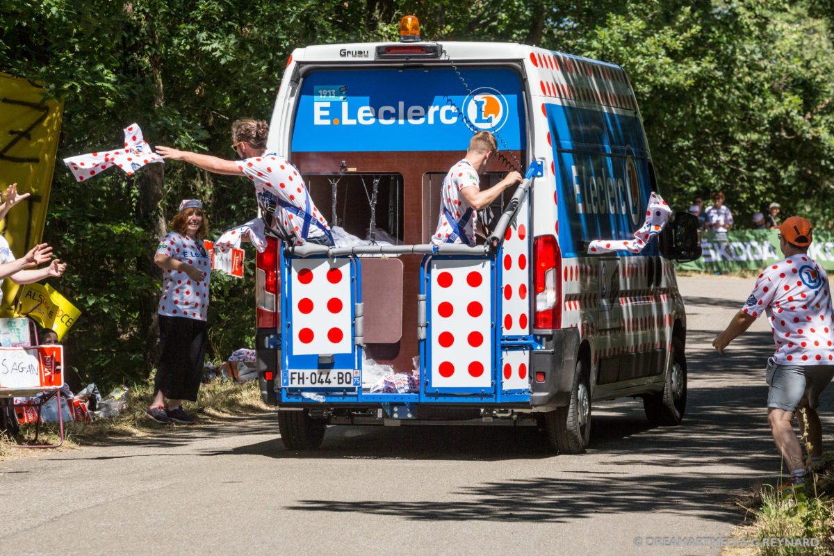 Au total, 4 camionnettes (3 personnes) accréditées partent à la rencontre du public afin de distribuer maillots et casquettes E.Leclerc. Tous les jours, les équipes dédiées préparent l’étape du lendemain avec soin en ciblant les zones intéressantes pour distribuer les goodies. Des t-shirts et casquettes qui reprennent la charte graphique du « nouveau » maillot du meilleur grimpeur, blanc à pois rouges avec dorénavant un pois bleu et orange en plus. Deux goodies prisés des spectateurs qui ne sont pas distribués par E.Leclerc au sein de la Caravane Publicitaire.