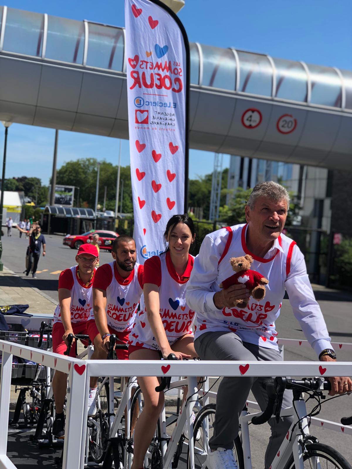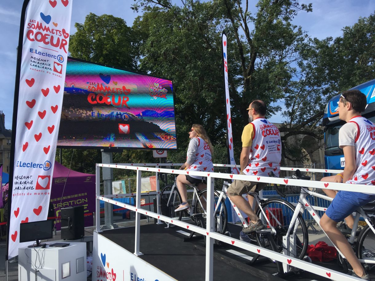 Avec les « Sommets du Cœur E.Leclerc », les spectateurs sont invités à pédaler sur un tandem géant réglé en mode « grimpeur ». Un écran géant les projette dans la peau d’un coureur en pleine ascension du col du Tourmalet. Installée aux abords des villages départ et arrivée, l’animation permettra de lever des fonds qui financeront des opérations d’enfants atteints de malformations cardiaques. Depuis le début du Tour à Bruxelles, plus de 4000 personnes ont déjà pédalé pour Mécénat Chirurgie Cardiaque.