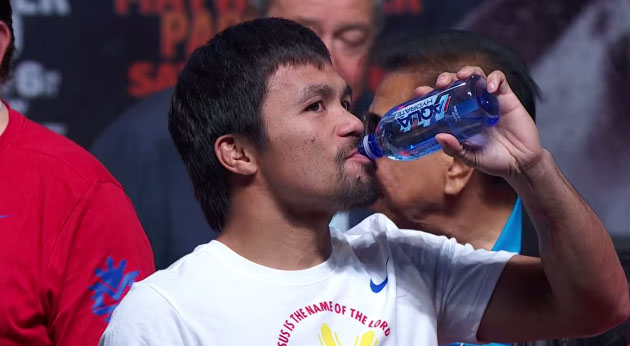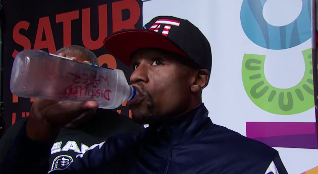 Si Mayweather et Pacquiao semblent partager peut de choses en commun, les deux boxeurs se sont retrouvés sur une chose, l’eau Aquahydrate. Si le premier n’a pas « offert » une visibilité lors de la pesée, la marque a bel et bien affirmé hydrater les deux boxeurs. Mayweather s’était d’ailleur affiché en marge du combat avec des bouteilles Aquahydrate. Le second à quand à lui bien bien montré la bouteille lors de la pesée. L’américain a lui affiché une mystérieuse bouteille où il était écrit « distilled water » (eau distillée).