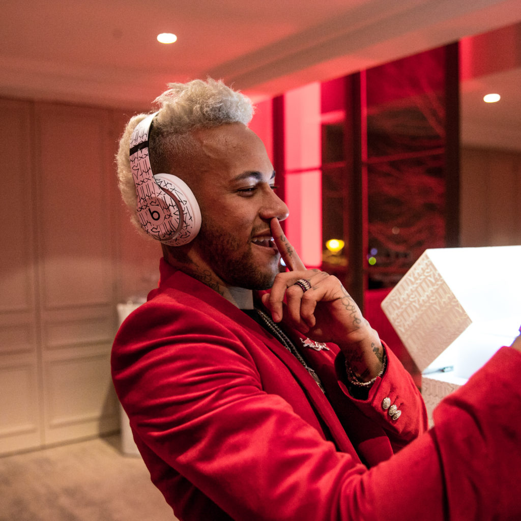 Lors de cette soirée, de nombreux invités ont reçu le casque arborant le numéro 10 sur le bandeau, référence au numéro de maillot de Neymar et à ses 10 ans de carrière de footballeur professionnel. Côté look, le casque conçu par Beats by Dre s’inspire du style graffiti des rues de São Paulo et de son tatouage « Shhh ».