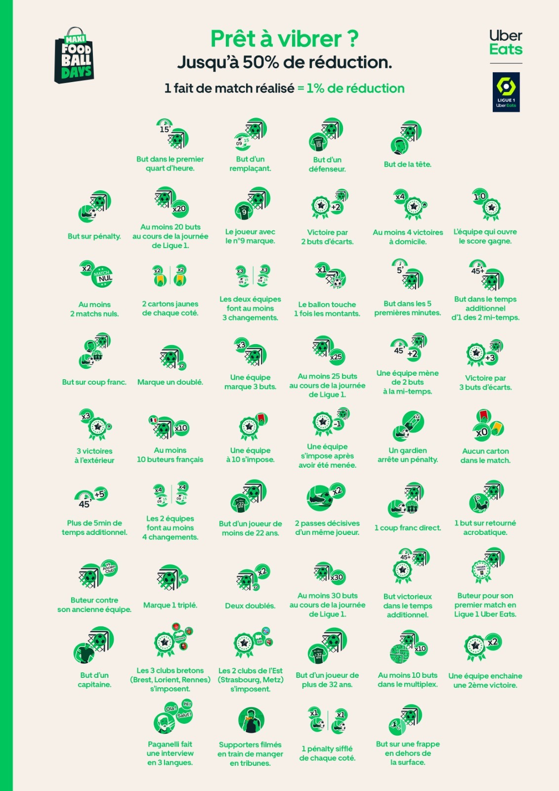 Au total, 50 faits de matchs sont édités et peuvent potentiellement offrir jusqu’à 50% de réduction avec « Maxi Foodball Days ».
