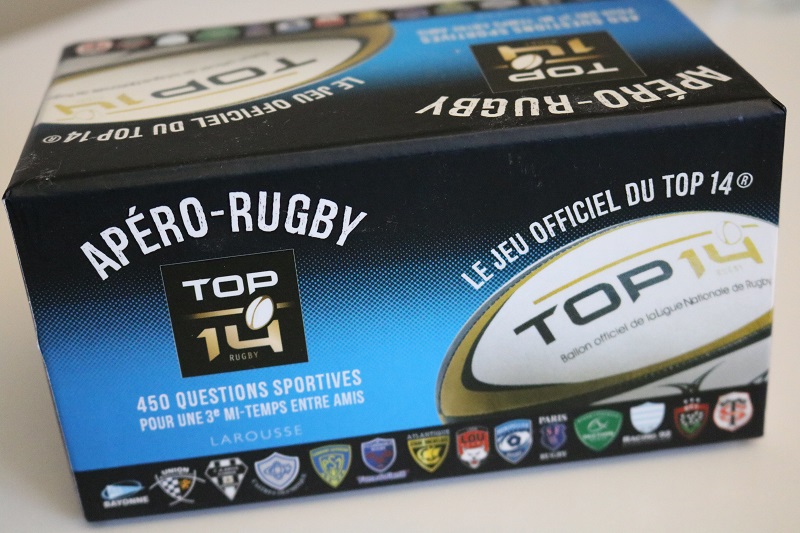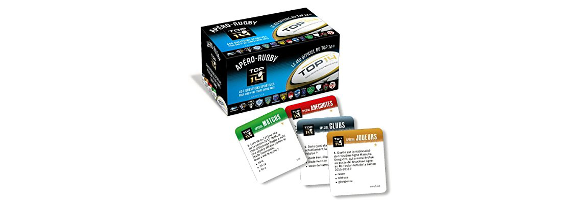 Avec ce jeu, les fans de rugby vont pouvoir tester leurs connaissances grâce aux 450 cartes/questions réparties en 4 catégories (Joueurs, Matchs, clubs, Anecdotes). Apéro-Rugby TOP 14 Ligue 1 est vente au prix conseillé de 10,95 €.