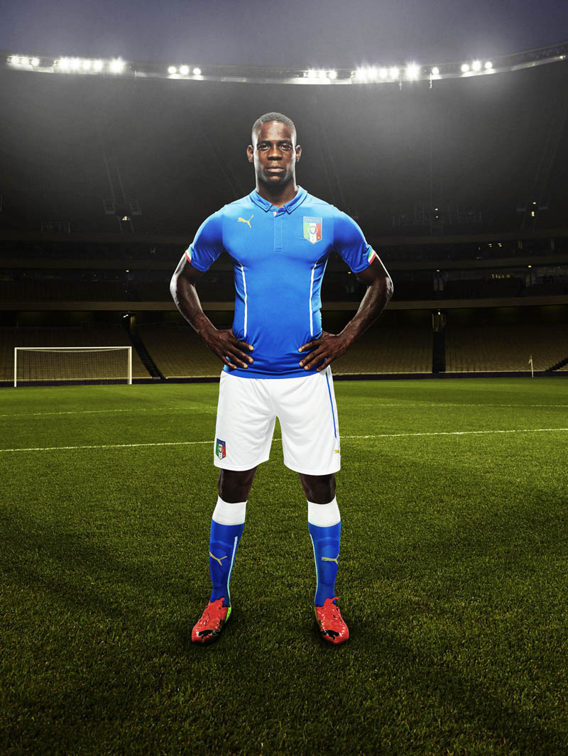 PUMA dévoile officiellement aujourd’hui le look des maillots de l’équipe d’Italie pour la Coupe du Monde 2014. Le nouveau maillot « domicile » sera porté par les joueurs italiens ce mercredi à l’occasion du match amical contre l’Espagne. Ambassadeur de l’équipementier allemand depuis quelques mois, l’international italien Mario Balotelli manquera cette rencontre.