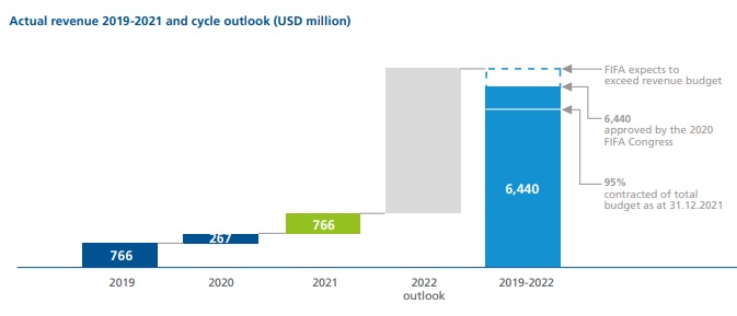 Sur le cycle de 4 ans 2019-2022, la FIFA est bien partie pour dépasser l’objectif fixé il y a quelques mois de 6,44 milliards de dollars de revenus. Au 31 décembre 2021, 95% des recettes budgétisées ont été assurées et la FIFA confirme que ces objectifs commerciaux seront dépassés à l’issue du mondial 2022.