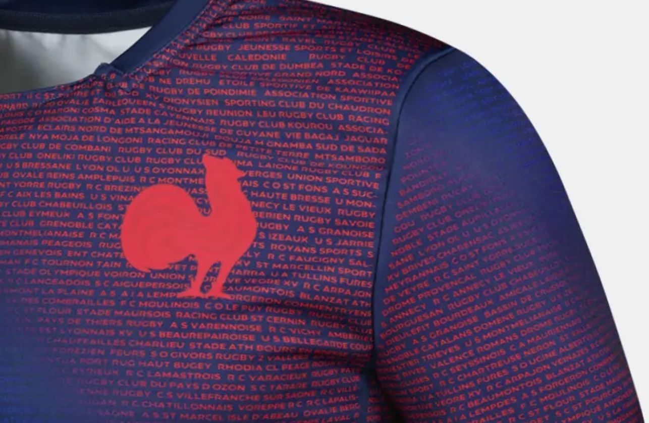 Pendant cette Coupe du Monde 2023 organisé sur le sol français, l’Equipe de France et Le Coq Sportif rendent hommage à l’ensemble des clubs de rugby amateurs. Sur le maillot d’échauffement des hommes de Fabien Galthié figure ainsi le nom de 1 946 clubs en rouge ou bleu donnant ainsi un style dégradé / effacé au maillot. Soit l’entièreté des clubs amateurs de rugby en France.