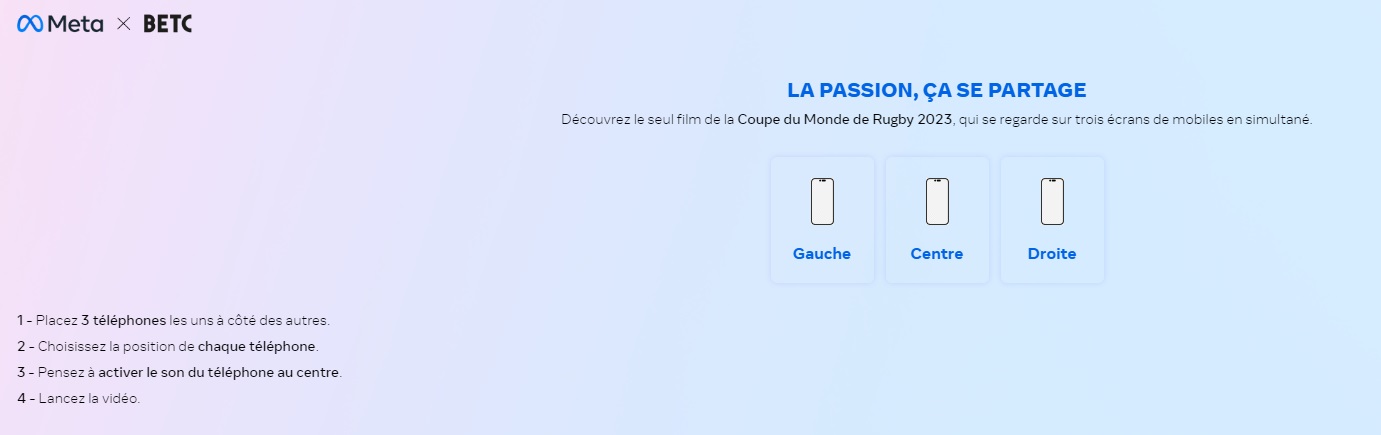 « Nous sommes très fiers d’être l’agence partenaire de Meta et de l’accompagner dans son premier partenariat sportif mondial » commente Olivier Apers, Vice-President / Executive Creative Director chez BETC. « Nous avons conçu une campagne intégrée pour cet incroyable événement qui a lieu en France cette année : « La passion, ça se partage ».Nous avons voulu créer un film inédit, un objet unique et hors du commun pour Meta, leader des réseaux sociaux : le premier film TV qui se déploie sur 3 écrans de mobiles pour inviter les fans à partager leur passion. »