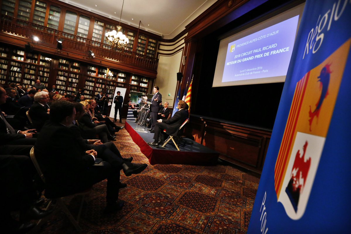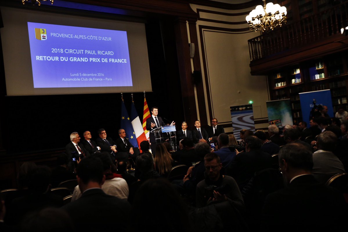 Hier, Christian Estrosi, Président de la Région Provence-Alpes-Côte d’Azur (PACA) a annoncé le retour du Grand Prix de France de Formule 1 sur le circuit Paul Ricard dès la saison 2018. Une conférence de presse était organisée à Paris au siège de l’Automobile club de France.